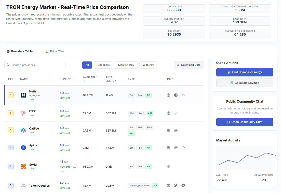 In the world of running your crypto better, network cost management services create an indispensable tool in your digital wallet. And for those constantly using the TRON network, smart shopping for energy rates can make all the difference in fee elimination. Netts service - TRON Energy Market Aggregator - compares and rents Energy at minimum rates possible! It offers over 20 providers on aggregation directly on a real-time basis to guarantee at all times you are receiving the lowest market price available for your transactions.