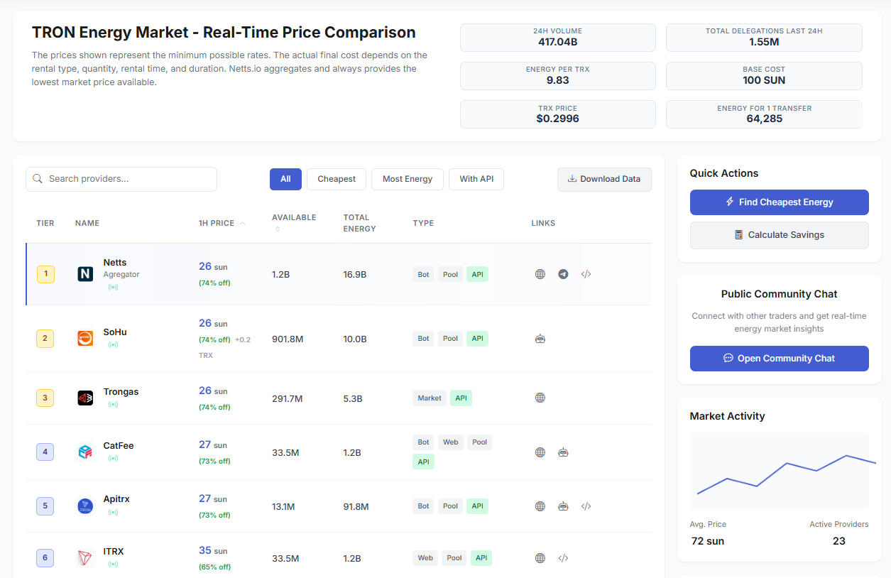 In the tumult of the crypto world, conducive innovation-support services have emerged to serve users’ tangible needs. A good example of this is Netts Energy Market, which offers the real-time comparison of the price to buy TRON Energy. As the TRON network has become increasingly popular, Energy costs and the effort to get Energy for transactions have been major issues for users as well as developers. Netts is the Energy leasing platform, that means guaranteed access to the best prices on Energy and we aggregate offers from top suppliers so you always know Energy costs are kept at a minimum!