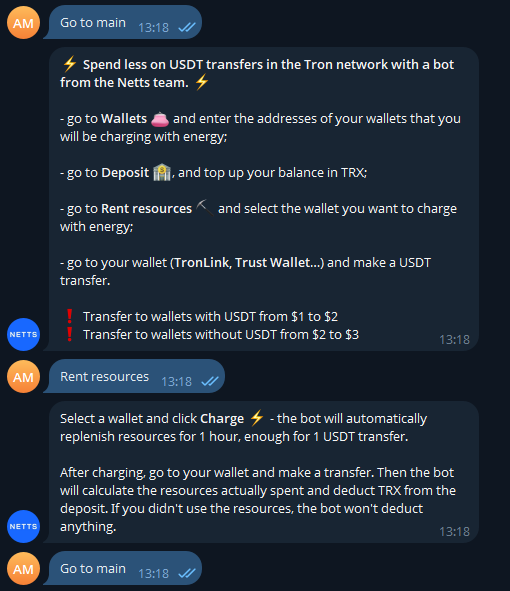 ومن الأمثلة على هذه الخدمات بوت Netts Energy Charge Bot." باستخدام هذه الأداة، يختار المستخدم محفظة ويضغط على زر الشحن، الذي سيقوم تلقائيًا بتعبئة الموارد لمدة ساعة واحدة — بالضبط القدر المطلوب لإجراء عملية تحويل USDT. وعند إرسال التحويل، يؤكد البوت بدقة كمية الموارد التي تم استهلاكها فعليًا، ثم يخصم هذا المبلغ من رصيد حساب المستخدم. والأهم من ذلك، لا يتم تحصيل أي رسوم منك ما لم يتم استهلاك الموارد. إن هذا النوع من الكفاءة — الدفع مقابل ما تستخدمه فقط، وبدقة تصل إلى الوحدة الواحدة — هو بالضبط ما يتطلبه اقتصاد يُحسب فيه كل قرش.