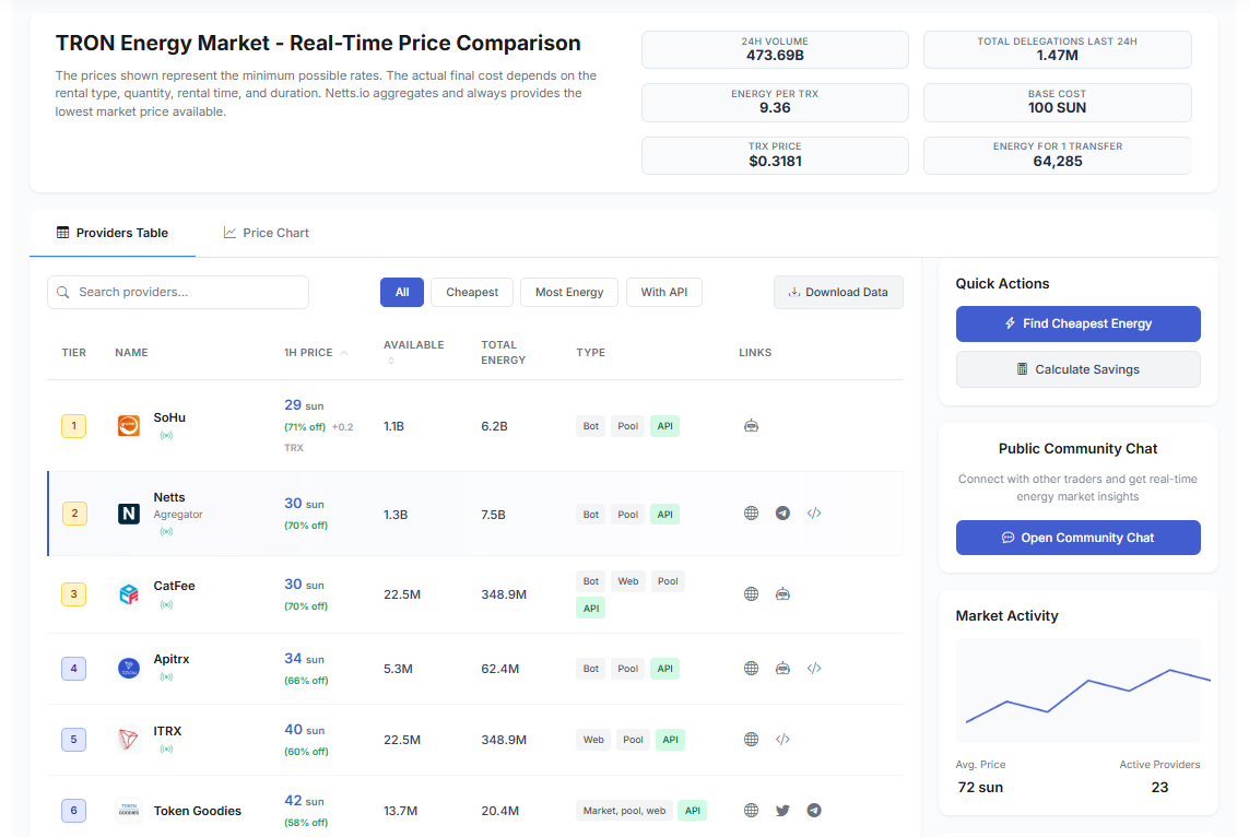 Netts is an essential tool for those creating this decentralized future in the TRON ecosystem, by providing a full-featured TRON Energy Market. The service is designed to compare the current price for your operational requirements, and it compares prices at various times of the day with hourly resolution. Netts covers the fixed costs of rental, compiles and lists the cheapest available market price. The platform brings a clear and concise way to handle usage-based costs, enabling the brains behind the next wave of healthcare apps to turn their attention to what matters - saving lives.