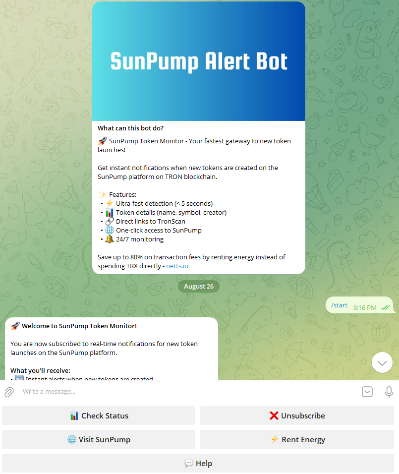 In addition to the core lending function, the bot provides fast menu actions for status checks and Energy rental, which turns the bot into a one-stop shop for active TRON users. SunPump Alert is your must-have tool for tracking the latest in TRON tokens.