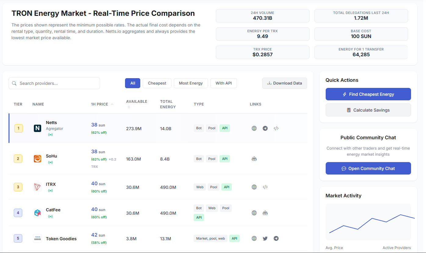 Netts.io ให้บริการตลาดพลังงาน (Energy Market) ของ TRON ที่ครบวงจร โดยรวบรวมข้อเสนอจากผู้ให้บริการทั้งหมดเพื่อตอบสนองความต้องการด้านพลังงานของผู้ใช้ทุกคนในราคาที่ดีที่สุดและคุณภาพสูงสุด นี่คืออินเทอร์เฟซที่เชื่อมต่อกับระบบเบื้องหลังที่มีความซับซ้อน โดยช่วยลดความยุ่งยากและทำให้ผู้ใช้สามารถจัดการต้นทุนการทำธุรกรรมได้อย่างมีประสิทธิภาพ โดยไม่จำเป็นต้องทราบรายละเอียดเชิงลึกของกระบวนการทำงานเบื้องหลัง (เช่น การมอบสิทธิ์ทรัพยากร หรือ delegate resources เป็นต้น) ซึ่งช่วยให้เครือข่ายเข้าถึงได้ง่ายขึ้นและทรงพลังกว่าที่เคย