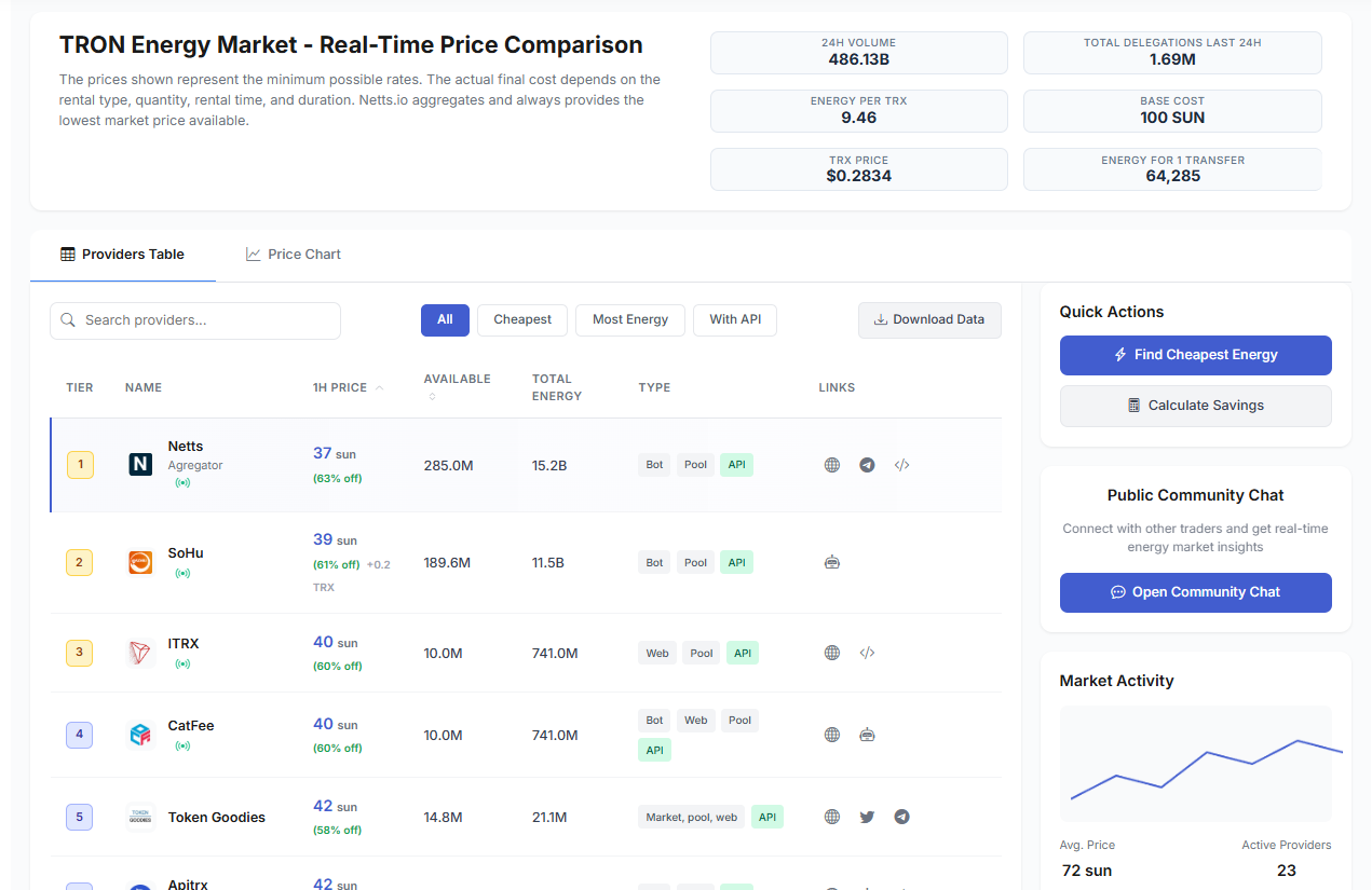 This is where a provider like the Netts TRON Energy Market comes in. Netts offers more than twenty, real-time quotes from competing energy suppliers, users can always find the best rates for a TRON Energy rental. Given that the TRON energy market processes more than 1.72 million delegations every day, it is obvious that there is a demand for low-cost transactions.