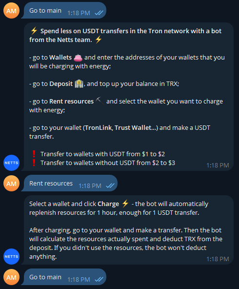 บอทนี้รองรับการเชื่อมต่อวอลเล็ตของคุณ และเมื่อคุณต้องการส่งธุรกรรม บอทจะเช่า Energy ในจำนวนที่จำเป็นต้องใช้สำหรับหนึ่งชั่วโมงโดยอัตโนมัติ เพื่อให้คุณไม่ต้องจ่ายเกินความจำเป็น จากนั้นหลังจากที่มีการโอนเกิดขึ้น บอทจะหักเงินจำนวนนั้นจากยอดคงเหลือของคุณ หากไม่มีการใช้เงินทุนก็จะไม่มีการหักเงินใดๆ ซึ่งถือเป็นวิธีที่ชาญฉลาดและราบรื่นในการมีส่วนร่วมกับระบบเศรษฐกิจของทรัพยากรที่มีอยู่จริงในเครือข่าย