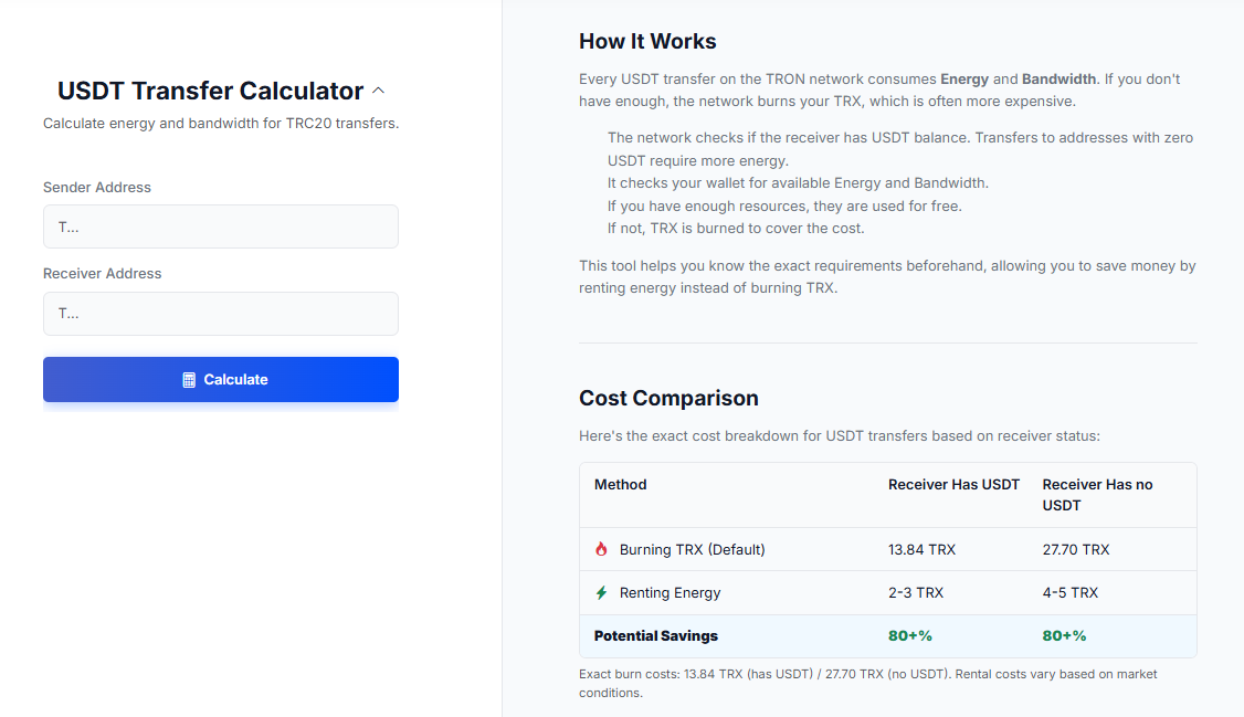 The Netts tool enables the user to enter sender address and receiver address to estimate the exact amount of resources required for sending. This reveals an important cost discrepancy: transfers to a recipient with a positive USDT balance burn about 13.84 TRX, while the burns related to transfers to a cold wallet (i.e., an address holding no USDT at all) are much more costly from the computational perspective, burning about 27.70 TRX. With this calculator (and also an API for dev), users can know if it is a good moment to rent Energy, Just so you know, renting Energy costs only 2-3 or 4-5 TRX, saving more than 80% compared to just burning TRX. This quick check ensures you're not overpaying network fees while still maintaining speedy transfers.