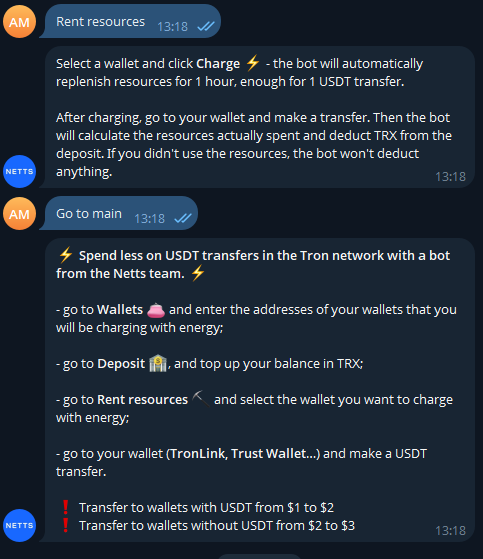 Netts Energy Charge Bot удовлетворяет конкретный спрос среди пользователей в сети Tron — снижение затрат на перевод USDT за счет арендованной Энергии.