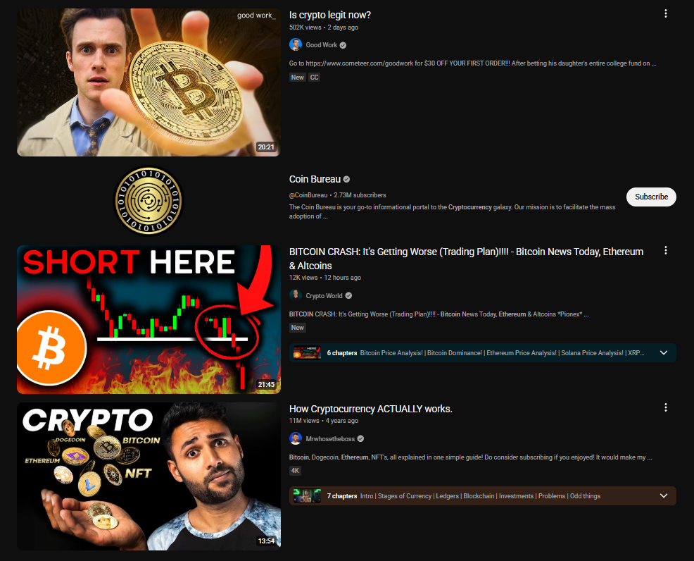 และสำหรับคริปโต ความจริงที่ปฏิเสธไม่ได้ก็คือ สำหรับคนส่วนใหญ่บนโลกใบนี้ การที่พวกเขาได้สัมผัสกับเทคโนโลยีที่ซับซ้อนและเปลี่ยนโลกนี้เป็นครั้งแรก มักจะมาจากวิดีโอบน YouTube เพียงไม่กี่คลิปเท่านั้น ปัจจุบันอินเทอร์เน็ตเปรียบเสมือนมหาวิทยาลัยของโลก และ YouTube ก็คือห้องบรรยายที่พลุกพล่าน วุ่นวาย และมีอิทธิพลมากที่สุด เมื่อผู้มาใหม่ที่อยากรู้อยากเห็นพิมพ์คำว่า “คริปโตเคอร์เรนซีคืออะไร” ลงในแถบค้นหาที่มีอยู่ทุกหนแห่ง อัลกอริทึมอันทรงพลังของแพลตฟอร์มจะทำหน้าที่เป็นทั้งศาสตราจารย์และผู้ออกแบบหลักสูตรให้พวกเขาโดยพฤตินัย